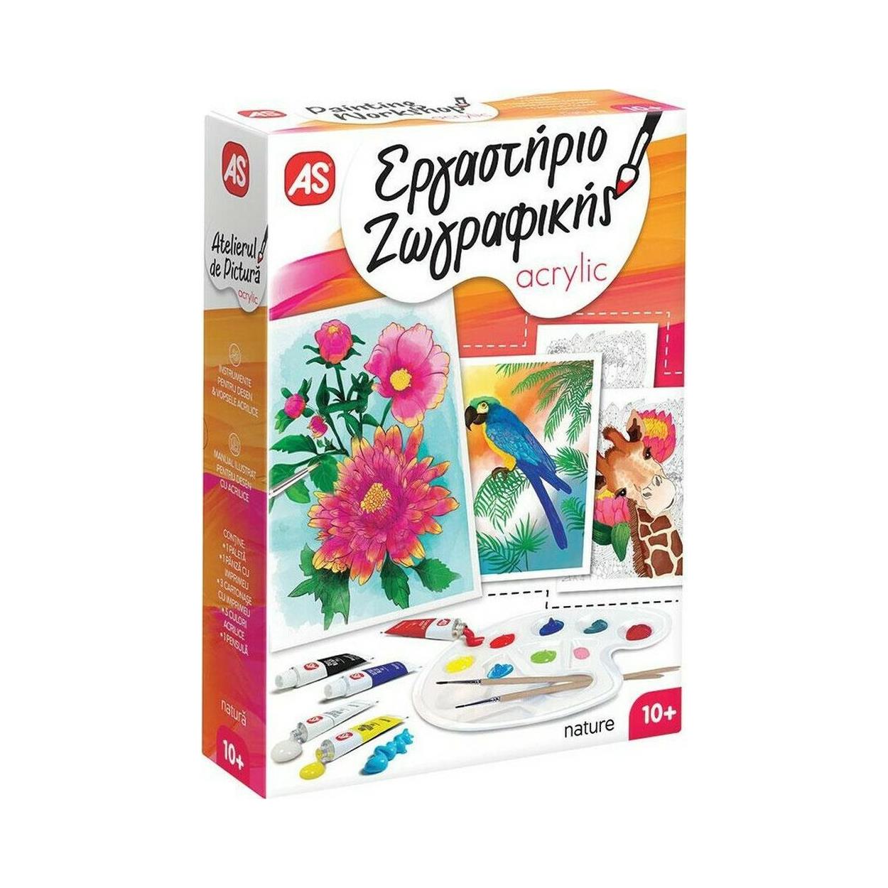 The Acrylic Painting Workshop - Nature is a complete painting set in practical size with Nature theme. It is ideal for children who love painting with acrylic paints, but also for children who want to get in touch with this technique for the first time. The set includes all the tools that the child needs, but also a detailed illustrated guide that guides them step by step in learning the acrylic technique. Beautiful designs pre-printed on canvas and cardboards, inspired by our natural environment, are waiting for the child to color them, making them look real. Use the 5 colors of the set as they are or mix them together in as many ways as you want, creating a unique color palette and gaining colors that are not included in the set.